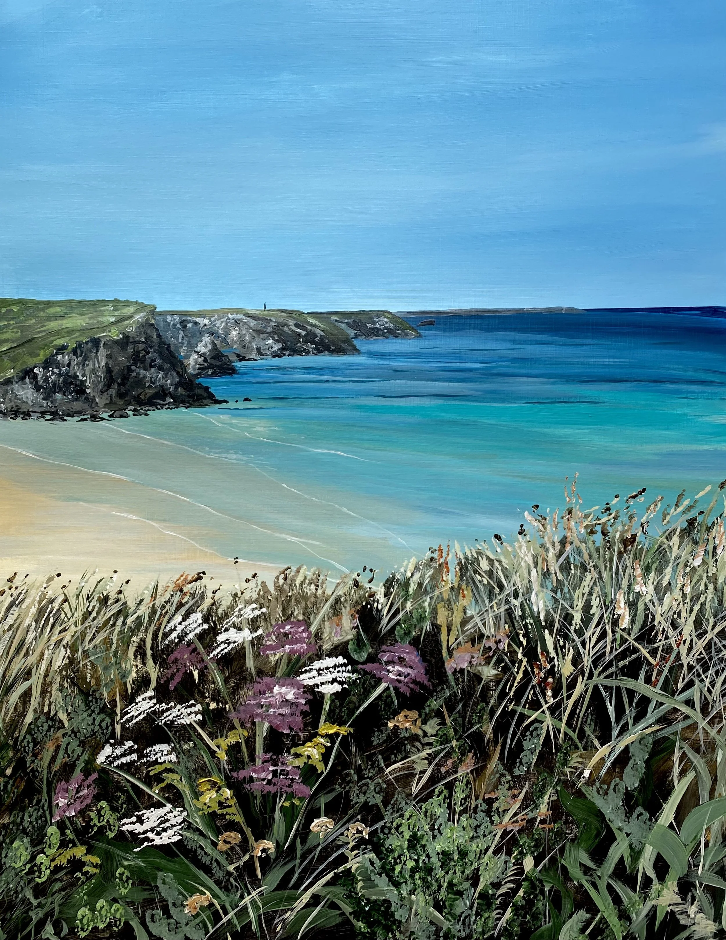 ‘I find that painting is a fine balance between spontaneity and knowledge. I fell in love with the ocean during lockdown, when daily walks along the coastline reminded me how calming and therapeutic it can be. Painting became my way of bringing that feeling home and sharing it with others. I love creating personal, unique pieces that reconnect people with special memories’.