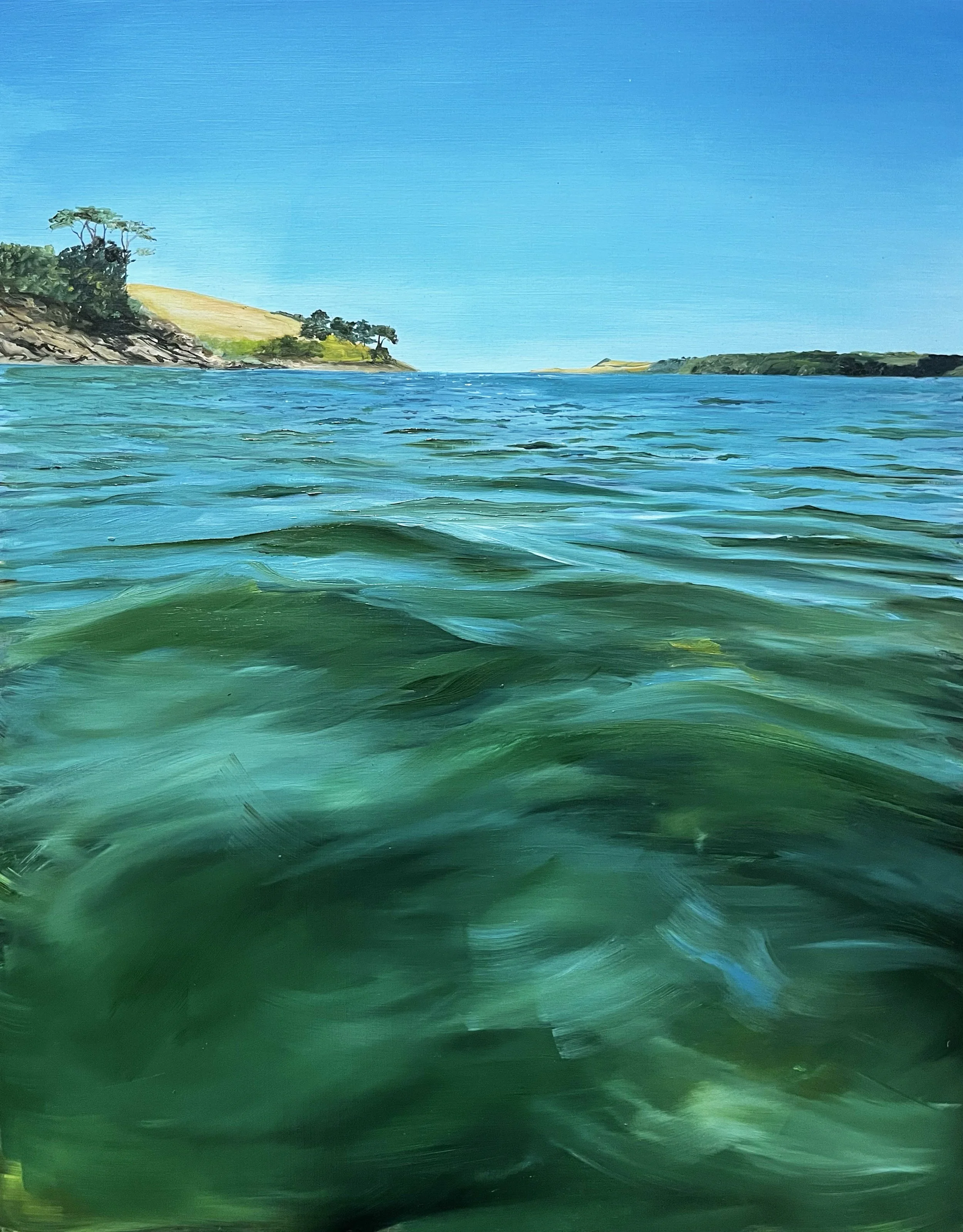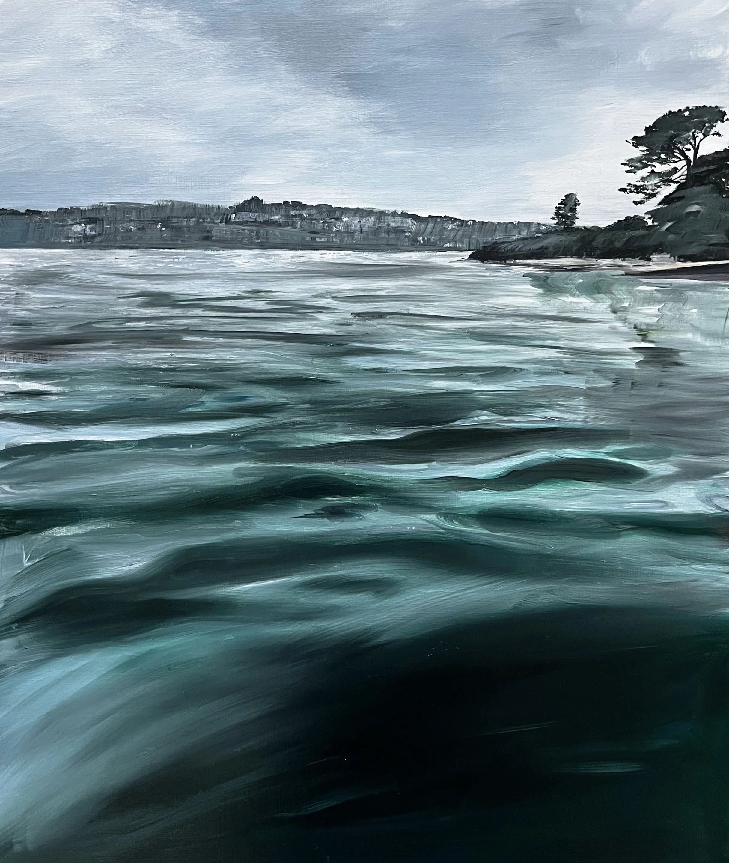 Her process starts on the water itself, often out on her paddleboard, where she takes reference photos, sketches and notes to remember the mood, movement and the energy of the sea. Back in her studio, she recreates those moments through her paints.